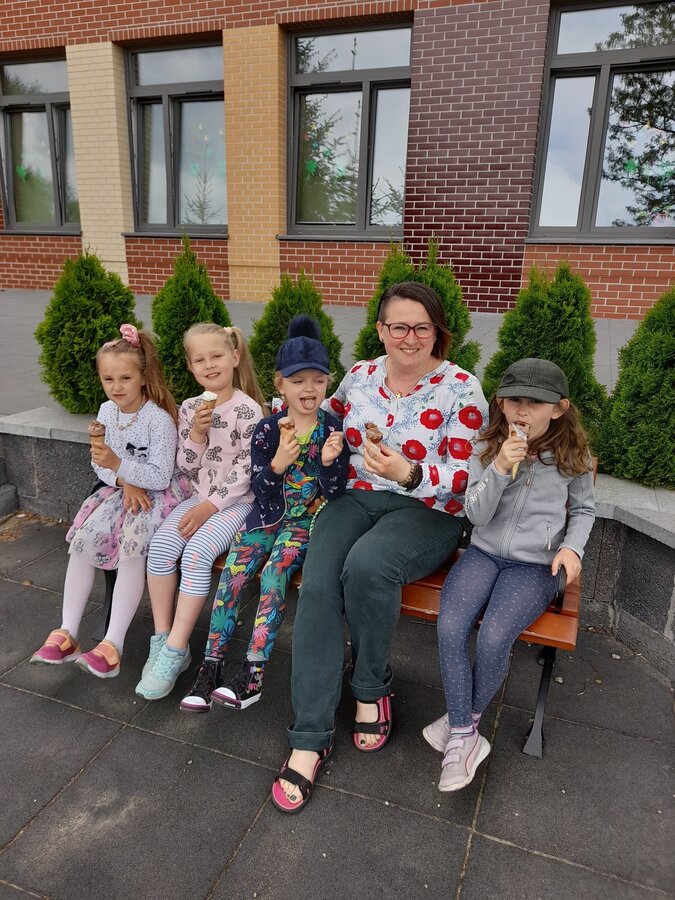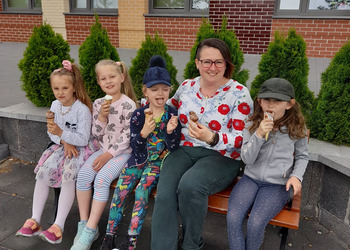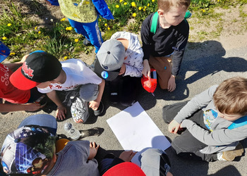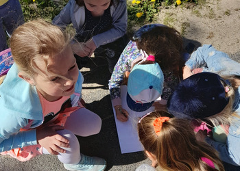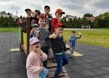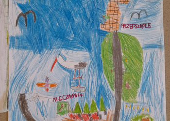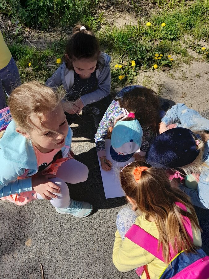 Podczas zajęć w terenie dzieci rysowały na mapie to, co widziały po drodze odwiedzając poszczególne miejsca w Jezierzycach Kościelnych. Pracowały w małych grupach i czerpały radość ze współpracy. Po powrocie powstały propozycje herbu Jezierzyc Kościelnych, a na koniec czekał słodki poczęstunek – lody:)