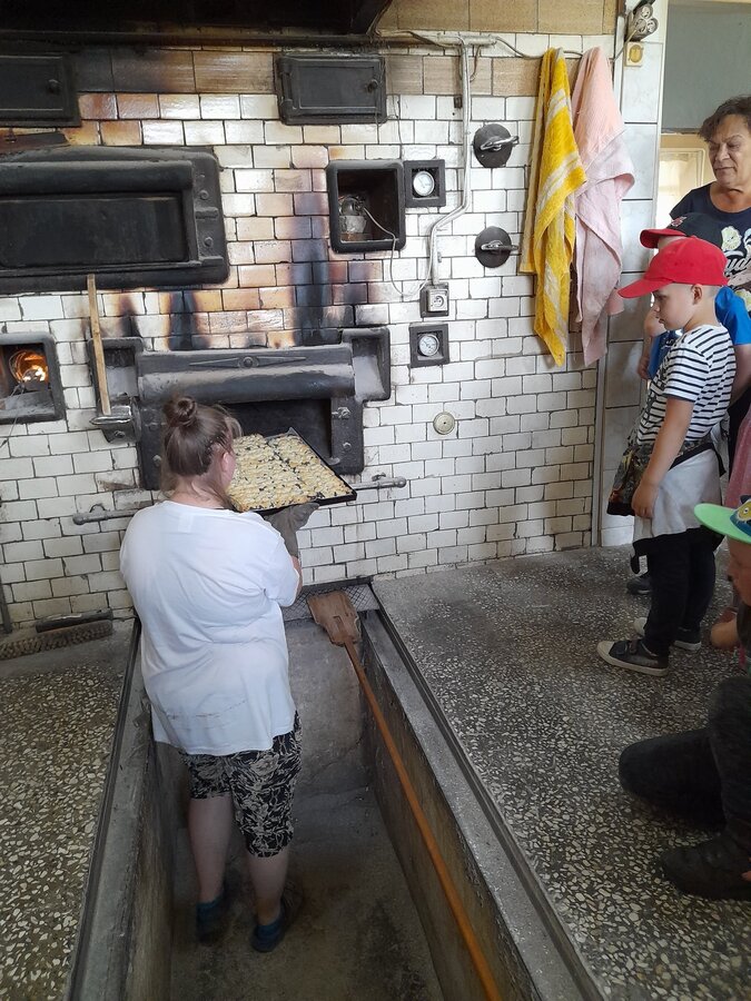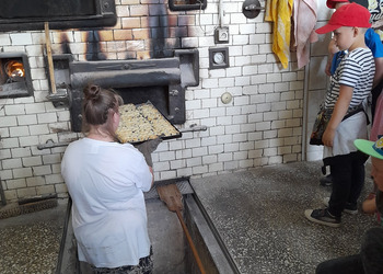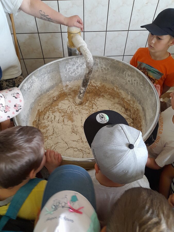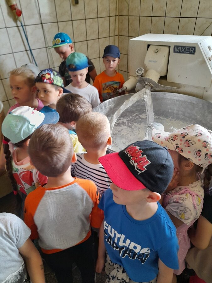Dzieci z grupy Misie podczas realizacji tematu: „Moja miejscowość, mój region”, wybrały się na wycieczkę. Zajęcia zaczęliśmy od poznania herbu i obszaru gminy Włoszakowice oraz Święciechowa. Dzieci wymieniały według własnego pomysłu godne zobaczenia miejsca z każdej miejscowości ( Zbarzewo, Gołanice i Jezierzyce Kościelne), a później udaliśmy się na spacer podczas, którego tworzyliśmy mapę Jezierzyc Kościelnych. Pierwszego dnia widzieliśmy mleczarnię, pracę rolników na polu, a także bociana stojącego na lampie w pobliżu swojego gniazda. W drugim dniu nasza trasa objęła takie miejsca jak Kwiaciarnia gdzie Pani Kamila opowiadała nam o Kwiatach, warzywach i drzewkach a także rodzaju ziemi, która odgrywa ważną rolę przy uprawie roślin, sadzenia rozsad czy wsadzania drzew iglastych. Na zakończenie spotkania w kwiaciarni otrzymaliśmy piękne kwiaty, które zdobią naszą salę przedszkolną, a jednocześnie dzieci uczą się dbania o nie. Następnym przystankiem była Piekarnia tradycyjna. U Pana Romana mogliśmy zobaczyć jak wygląda piekarnia od środka. Z wielkim zainteresowaniem dzieci przyglądały się pracy piekarzy, utrwaliły sobie etapy powstawania pieczywa oraz produkty potrzebne do jego wypieku. Przedszkolaki zobaczyły duże maszyny niezbędne do pracy piekarza m.in. misy na ciasto, maszyny do wyrabiania ciasta na pieczywo oraz ogromny piec do jego wypiekania. Na podsumowanie tego spotkania każdy poczęstował się ciasteczkiem.