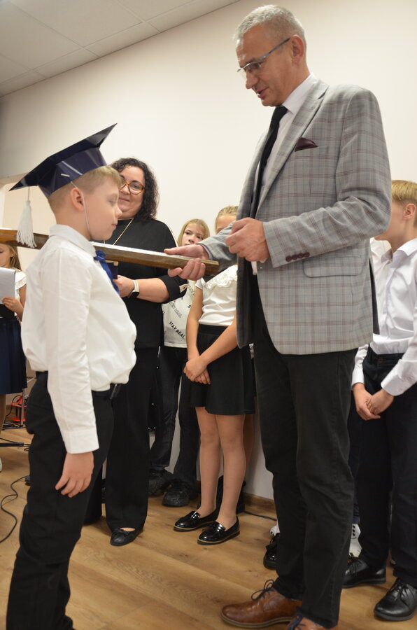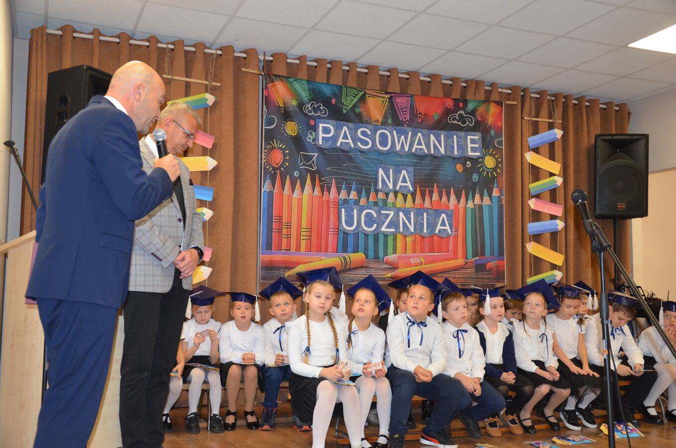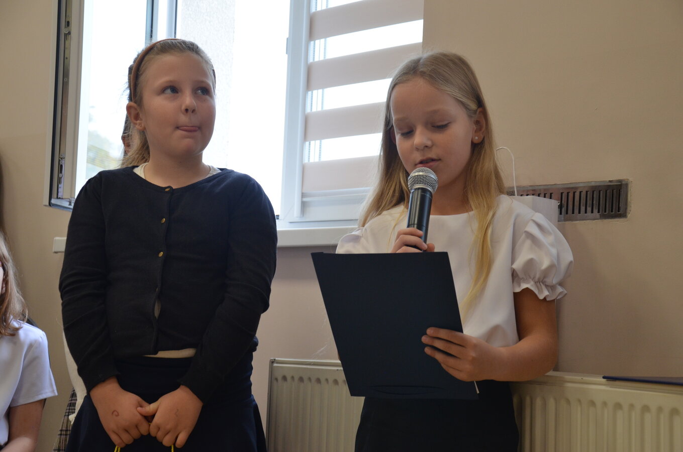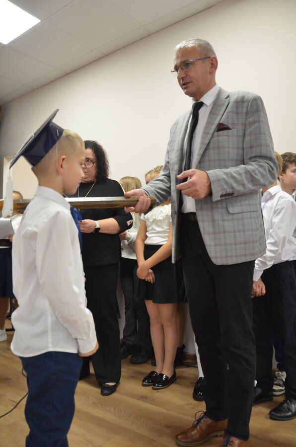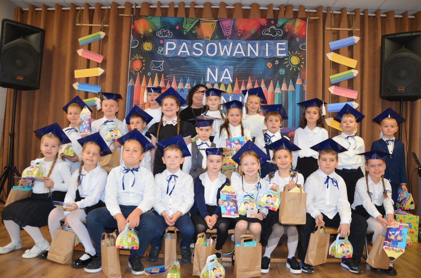 Dzisiaj 14.10.2025r. w naszej szkole odbyła się wyjątkowa uroczystość – Pasowanie dzieci z klasy pierwszej na Uczniów oraz uroczysta akademia z okazji Dnia Edukacji Narodowej. Był to dla nich szczególny dzień. Przybyły do szkoły w galowych strojach w towarzystwie Rodziców z dumą zaprezentowały swoje umiejętności zdobyte podczas pierwszego miesiąca nauki. Pokazały, jak pięknie potrafią śpiewać i recytować wiersze. Zostały serdecznie powitane w gronie społeczności uczniowskiej przez starszych kolegów. Następnie odbyło się uroczyste ślubowanie, zaś punktem kulminacyjnym imprezy był akt pasowania dokonany przez Pana Dyrektor . Od tej chwili wszystkie dziewczynki stały się pełnoprawnymi uczennicami, zaś chłopcy – pełnoprawnymi uczniami Szkoły Podstawowej im Tadeusza Kościuszki w Jezierzycach Kościelnych.