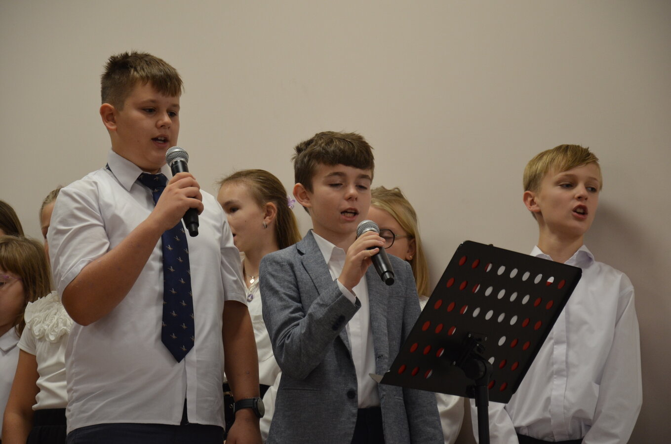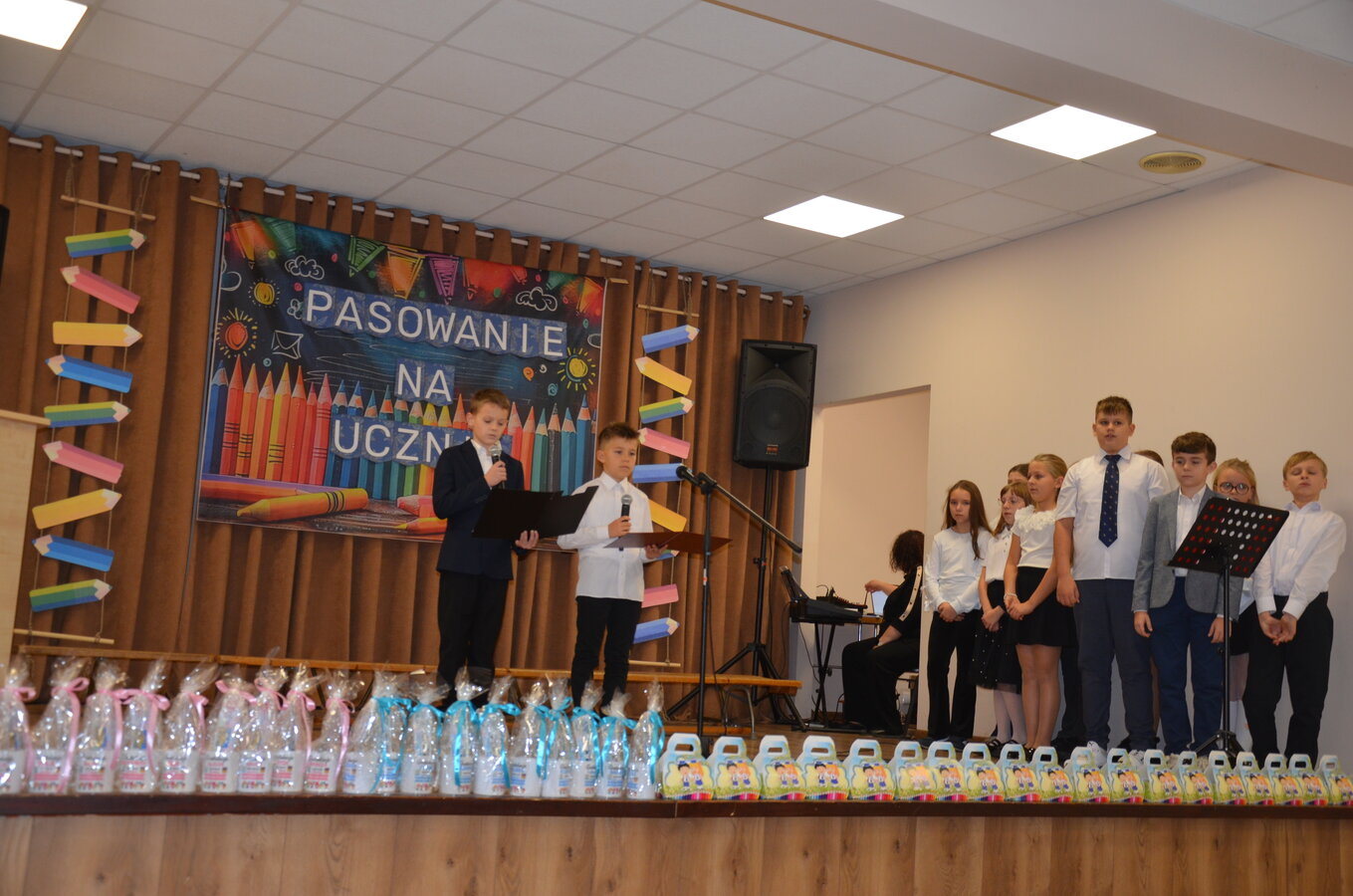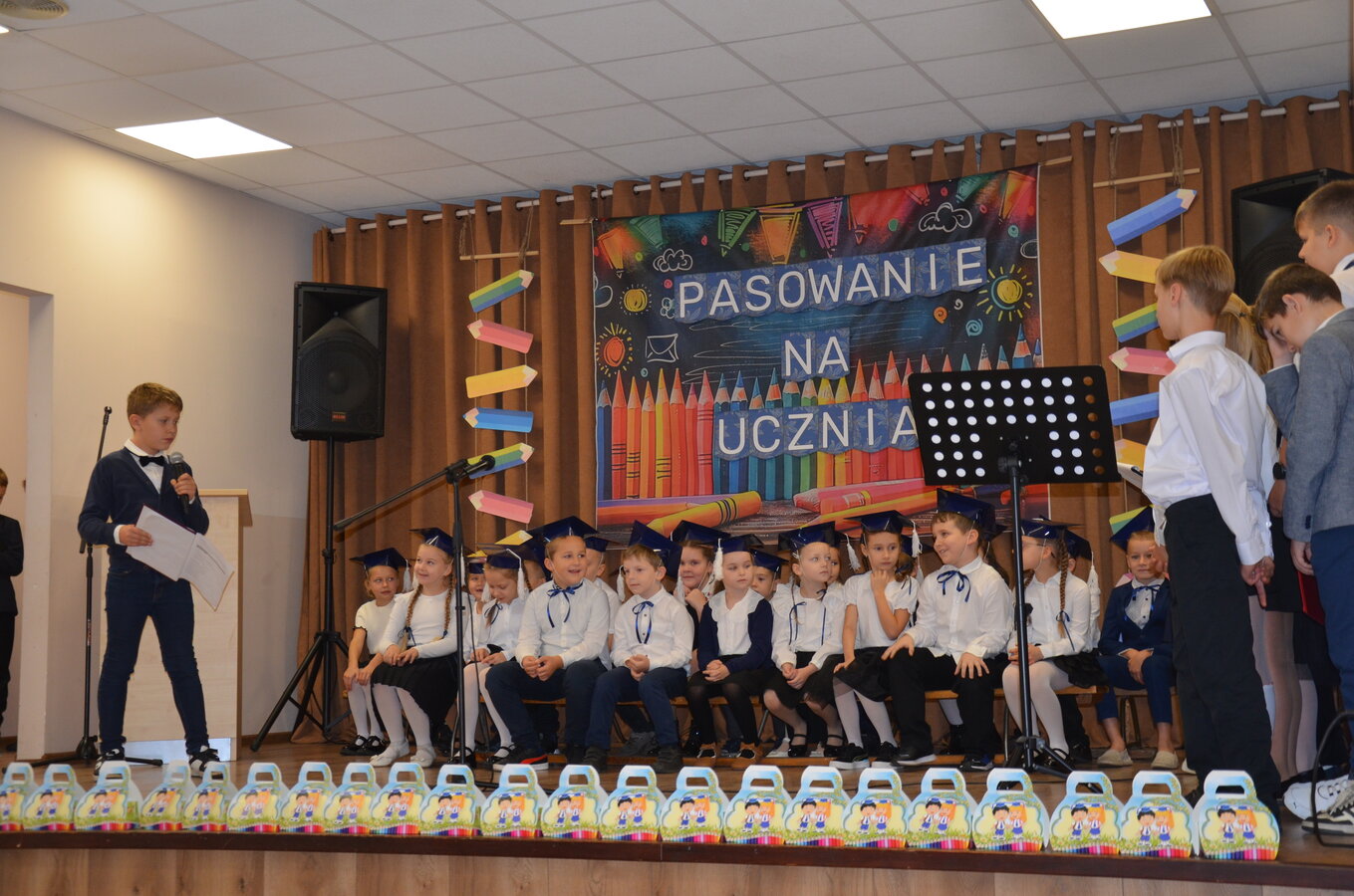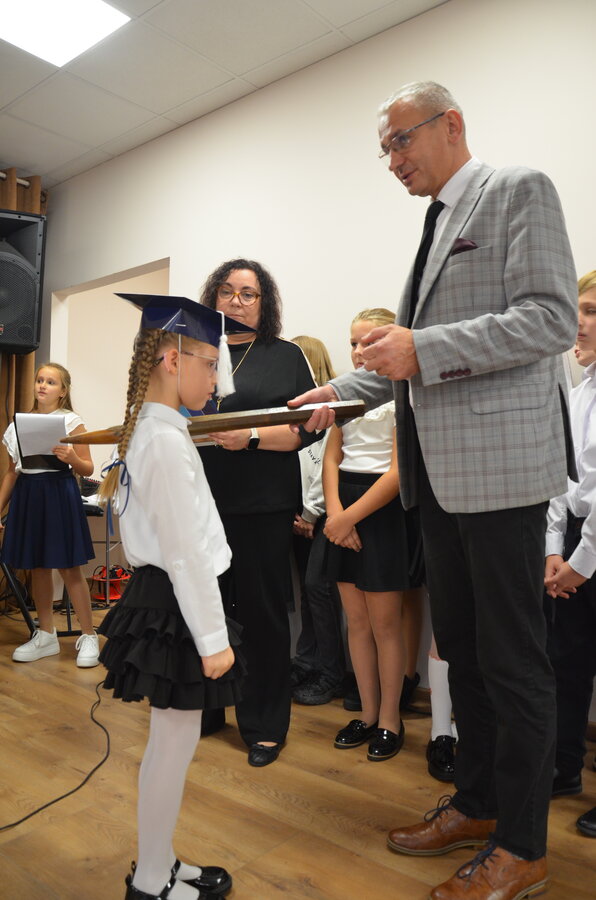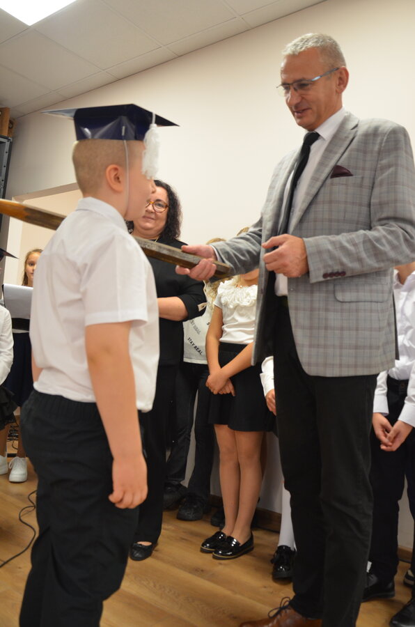 Dzisiaj 14.10.2025r. w naszej szkole odbyła się wyjątkowa uroczystość – Pasowanie dzieci z klasy pierwszej na Uczniów oraz uroczysta akademia z okazji Dnia Edukacji Narodowej. Był to dla nich szczególny dzień. Przybyły do szkoły w galowych strojach w towarzystwie Rodziców z dumą zaprezentowały swoje umiejętności zdobyte podczas pierwszego miesiąca nauki. Pokazały, jak pięknie potrafią śpiewać i recytować wiersze. Zostały serdecznie powitane w gronie społeczności uczniowskiej przez starszych kolegów. Następnie odbyło się uroczyste ślubowanie, zaś punktem kulminacyjnym imprezy był akt pasowania dokonany przez Pana Dyrektor . Od tej chwili wszystkie dziewczynki stały się pełnoprawnymi uczennicami, zaś chłopcy – pełnoprawnymi uczniami Szkoły Podstawowej im Tadeusza Kościuszki w Jezierzycach Kościelnych.
