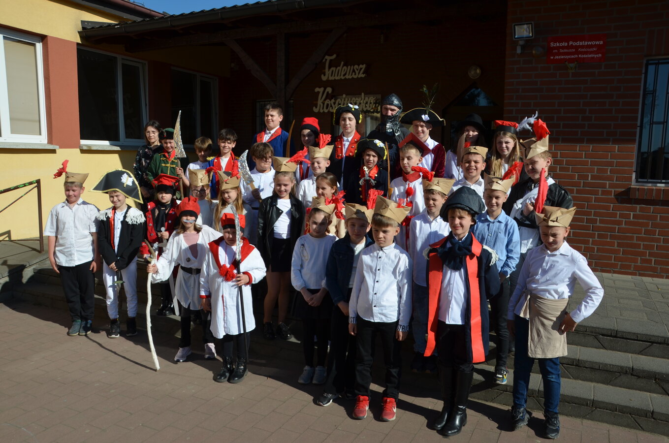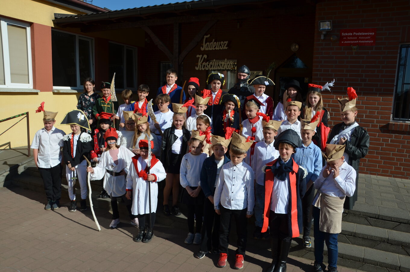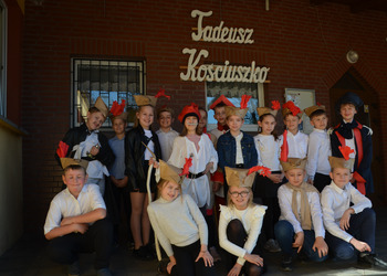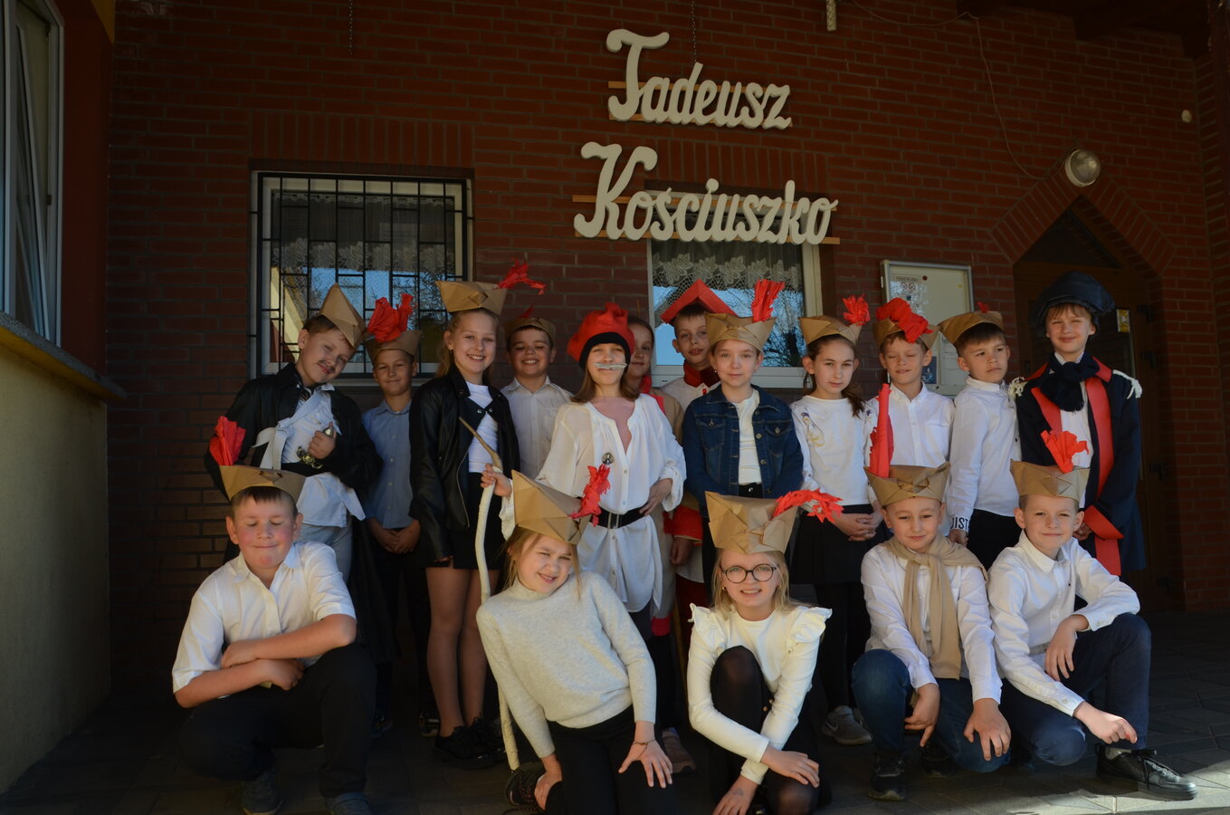 Dnia 4 kwietnia, w kolejną rocznicę bitwy pod Racławicami, obchodziliśmy Dzień Patrona Szkoły - Tadeusza Kościuszki. Niektóre dzieci przebrały się w stroje historyczne nawiązujące do czasów, w których żył nasz bohater. Można było podziwiać strój kadeta Szkoły Rycerskiej, Wojciecha Bartosa i samego Naczelnika powstania. Tego dnia mogliśmy poszerzyć swoją wiedzę o Tadeuszu Kościuszce: układaliśmy puzzle, wykonywaliśmy czapkę krakuskę metodą origami, budowaliśmy kopiec Kościuszki z klocków, układaliśmy plan lekcji, który mógłby obowiązywać w Szkole Rycerskiej, pracowaliśmy z mapą i tekstami źródłowymi, dowiedzieliśmy się co mają wspólnego samoloty myśliwskie z Kościuszką oraz poszukiwaliśmy współczesnych miejsc związanych z naszym bohaterem. Dziękujemy wszystkim, którzy zaangażowali się w naszą zabawę.