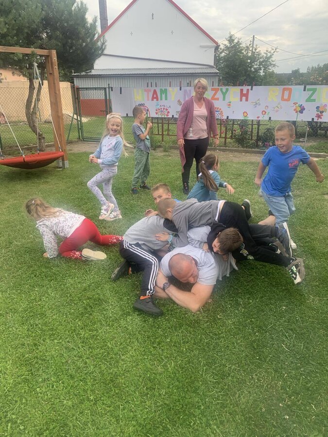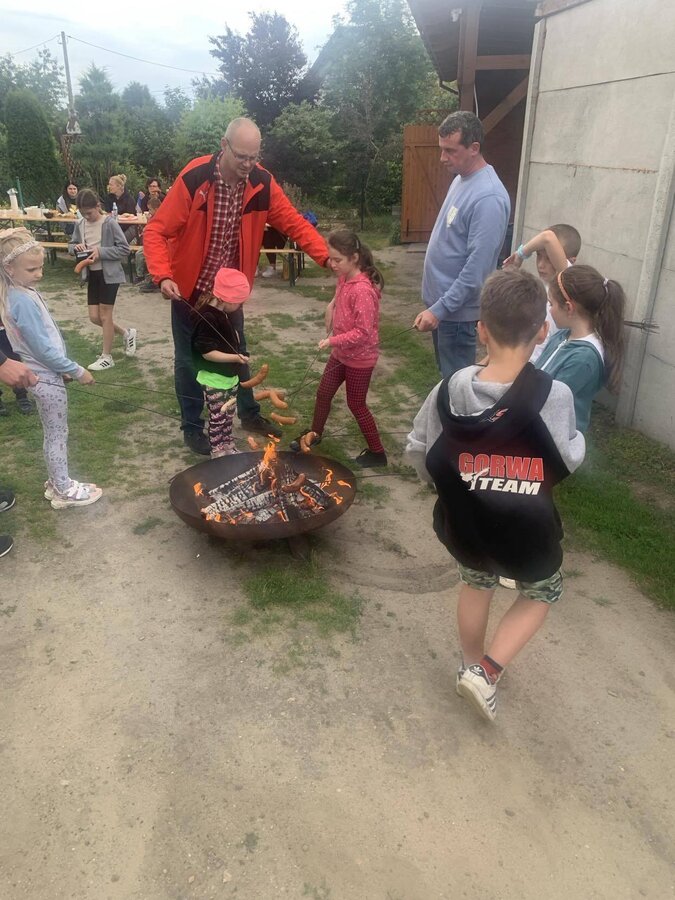 Dzień Rodziny to wspaniały czas dla dzieci i rodziców. Z tej okazji uczniowie klasy pierwszej oraz ich rodzice spotkali się się w ogrodzie państwa Maćkowiak. Najpierw dzieci zaprezentowały się w wierszach, piosenkach i tańcu. Wręczyły najbliższym laurki oraz upominki – kule kwiatowe, które wcześniej samodzielnie wykonały na zajęciach ekologicznych. Następnie wszyscy zasiedli do stołów, gdzie były ciasteczka, owoce i napoje. Później był czas na wspólne zabawy. Były różne konkurencje: wyścig z balonami, siatkówka balonowa, wyścigi taczek. Myślę, że dobrze bawiły się zarówno dzieci jak i rodzice. Na koniec był czas na smażenie kiełbasek, które wszyscy zajadali ze smakiem. Dziękuję bardzo osobom, które zapewniły poczęstunek dla wszystkich oraz państwu Maćkowiak za przygotowanie imprezki.
