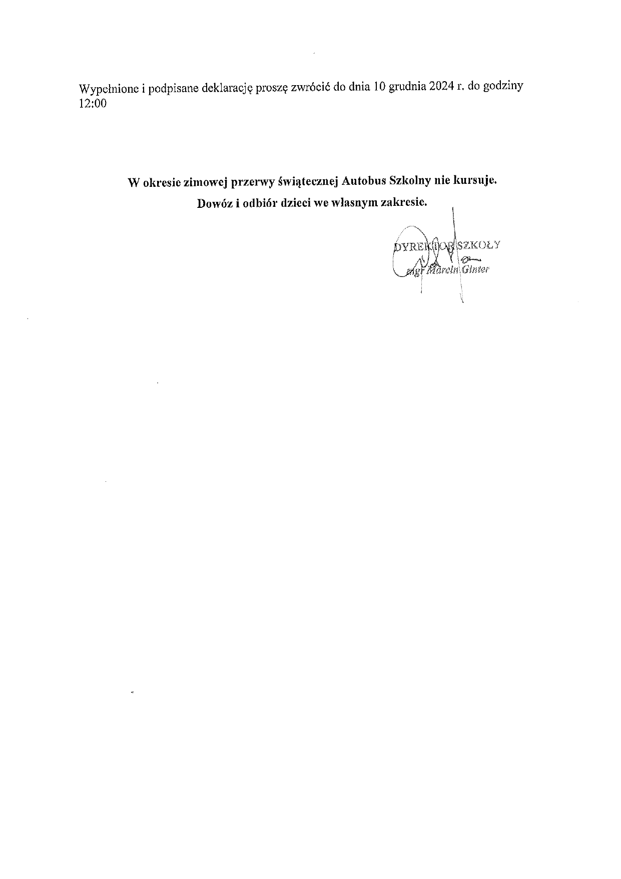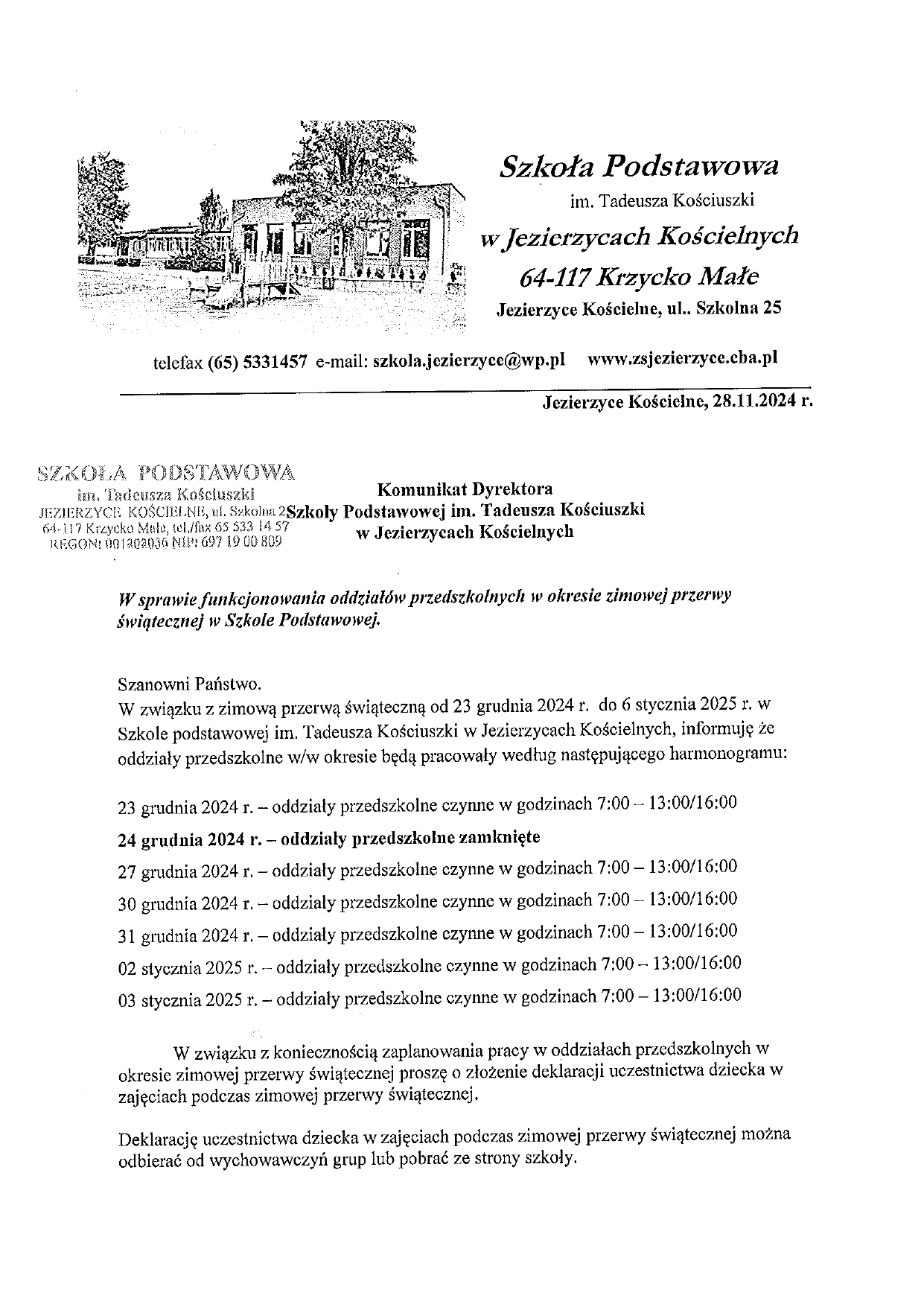 Komunikat dyrektora szkoły w sprawie funkcjonowania oddziałów przedszkolnych w czasie zimowej przerwy świątecznej
