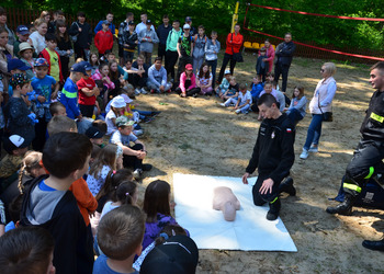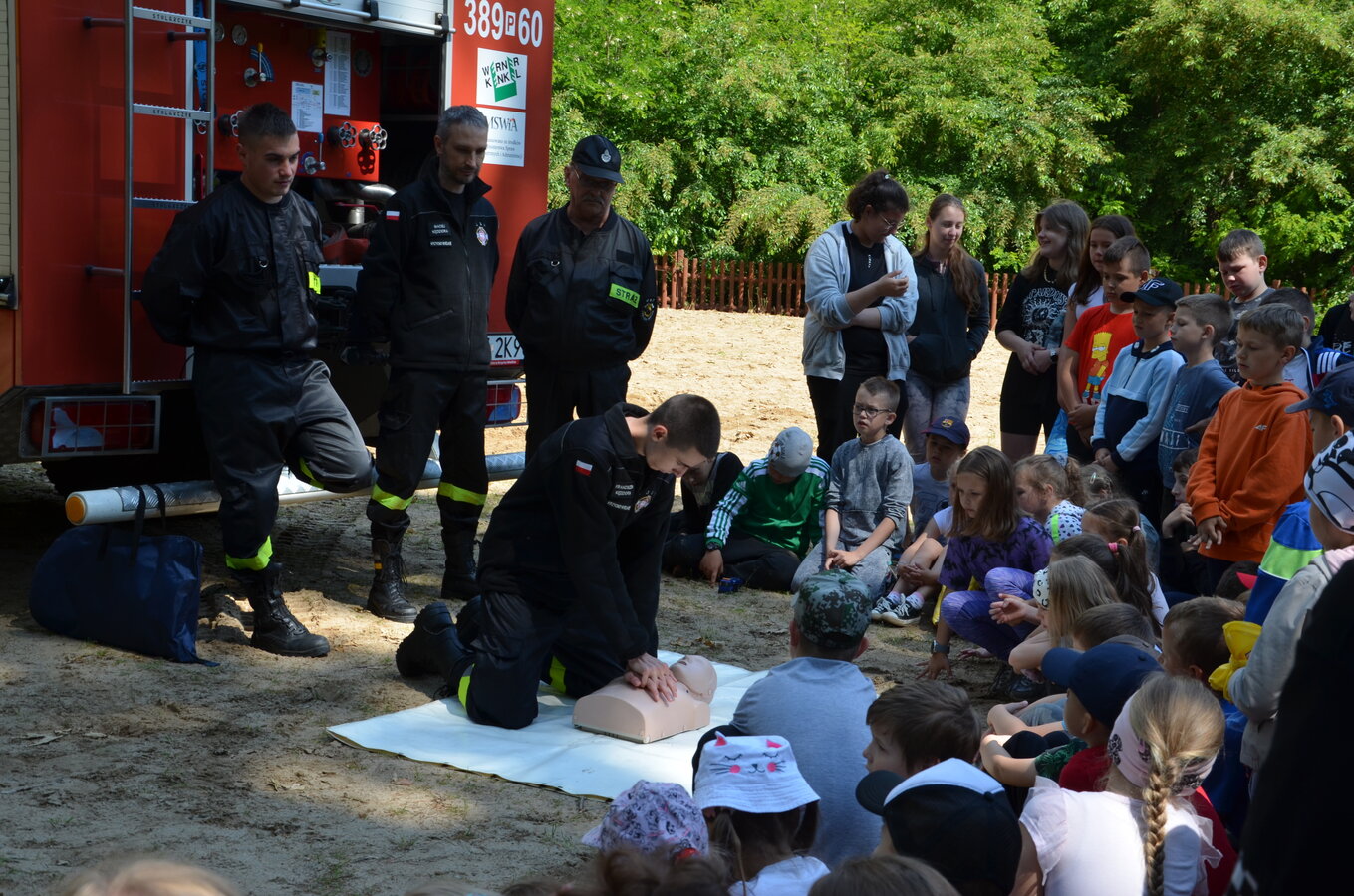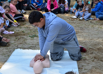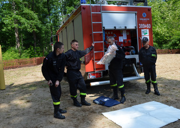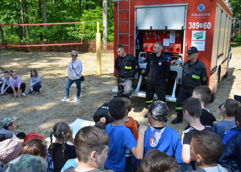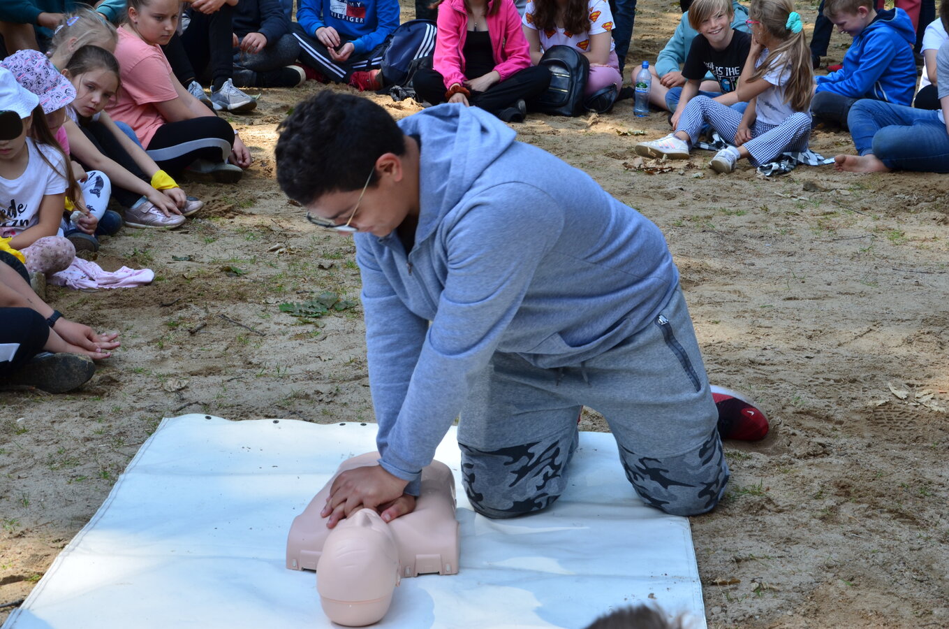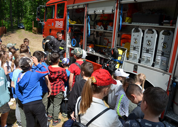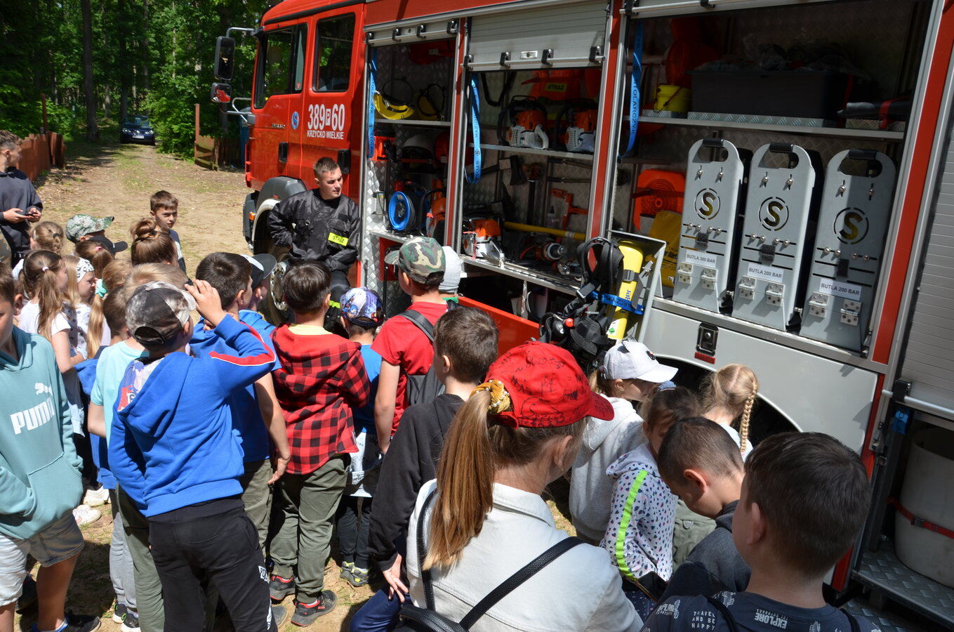 Ostatnim punktem zajęć terenowych była wizyta strażaków z OSP Krzycko Wielkie. Najmłodsi uczniowie mieli okazję obejrzeć z bliska wóz strażacki. Dla starszych uczniów strażacy przygotowali pokaz udzielania pierwszej pomocy przedmedycznej oraz odpowiadali na zadawane pytania.
