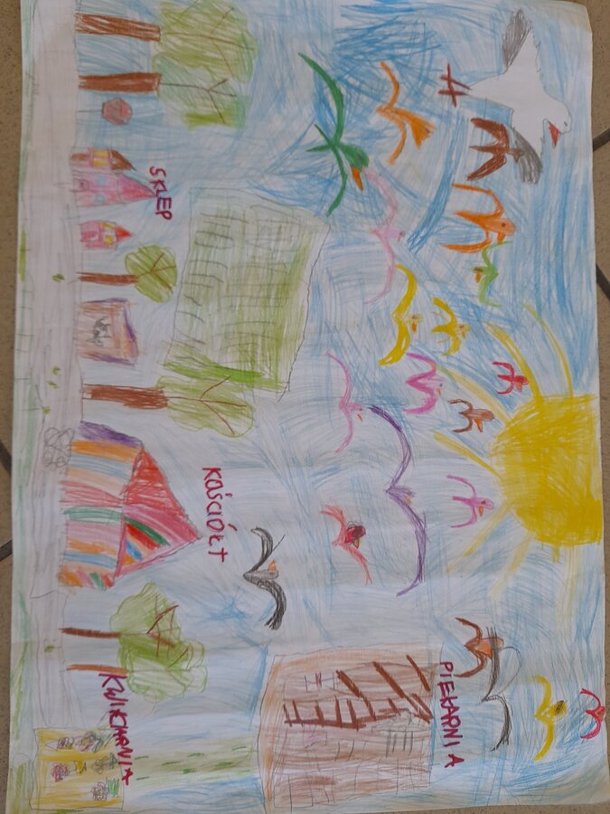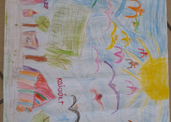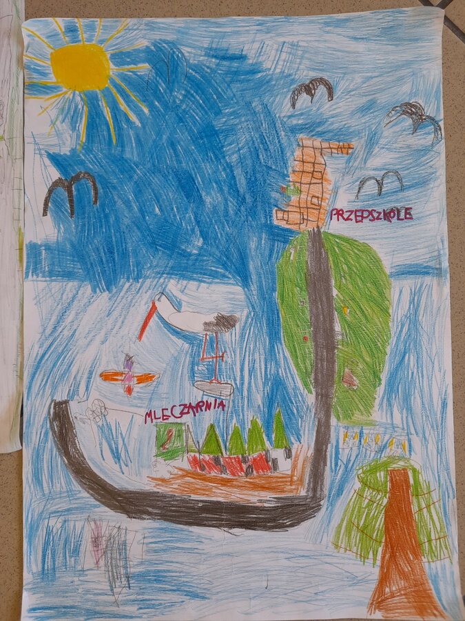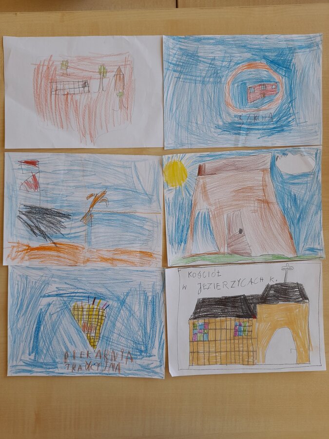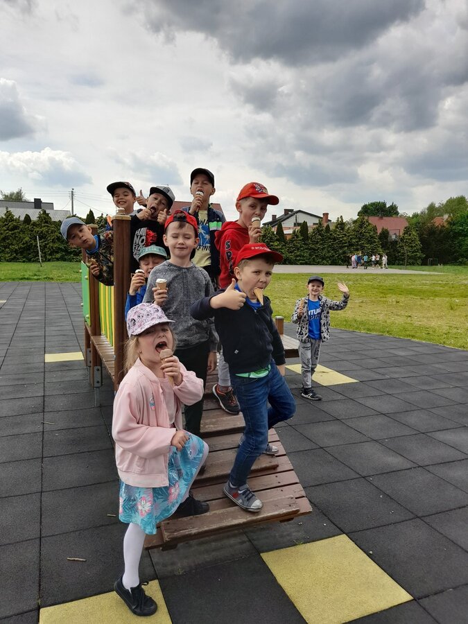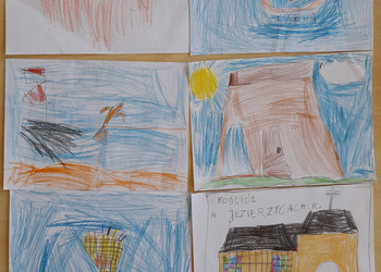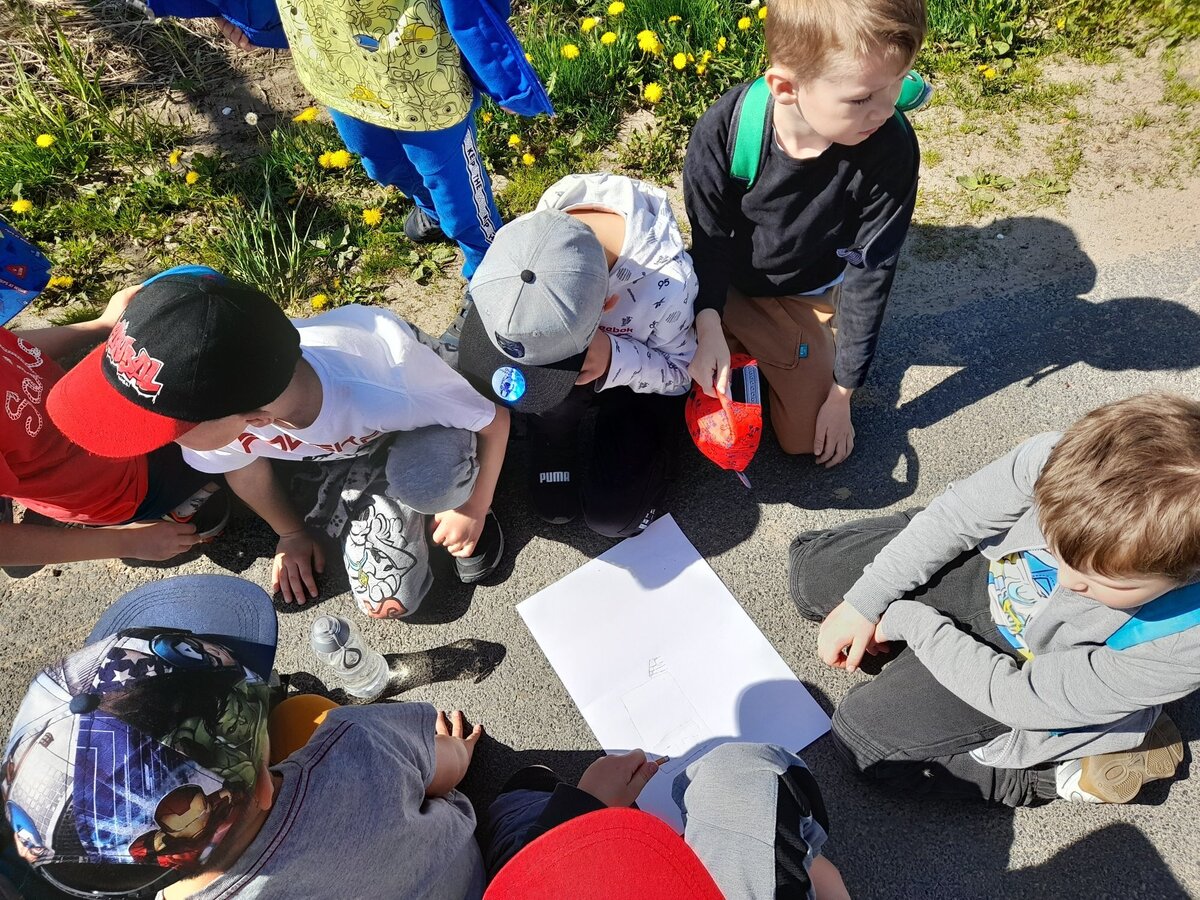 Podczas zajęć w terenie dzieci rysowały na mapie to, co widziały po drodze odwiedzając poszczególne miejsca w Jezierzycach Kościelnych. Pracowały w małych grupach i czerpały radość ze współpracy. Po powrocie powstały propozycje herbu Jezierzyc Kościelnych, a na koniec czekał słodki poczęstunek – lody:)