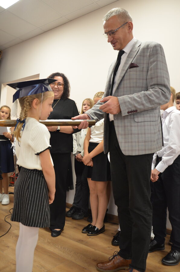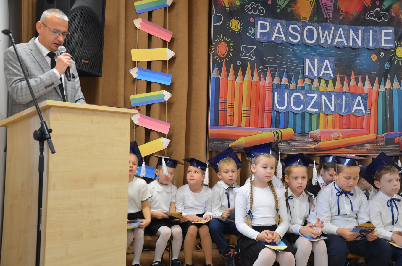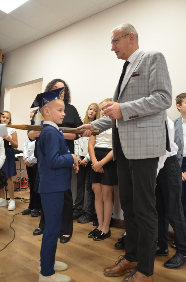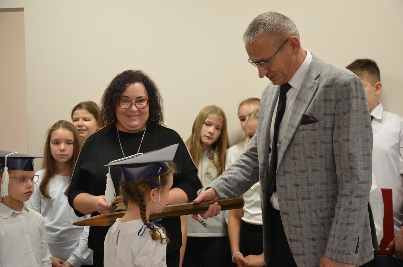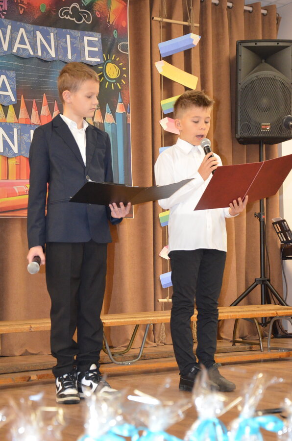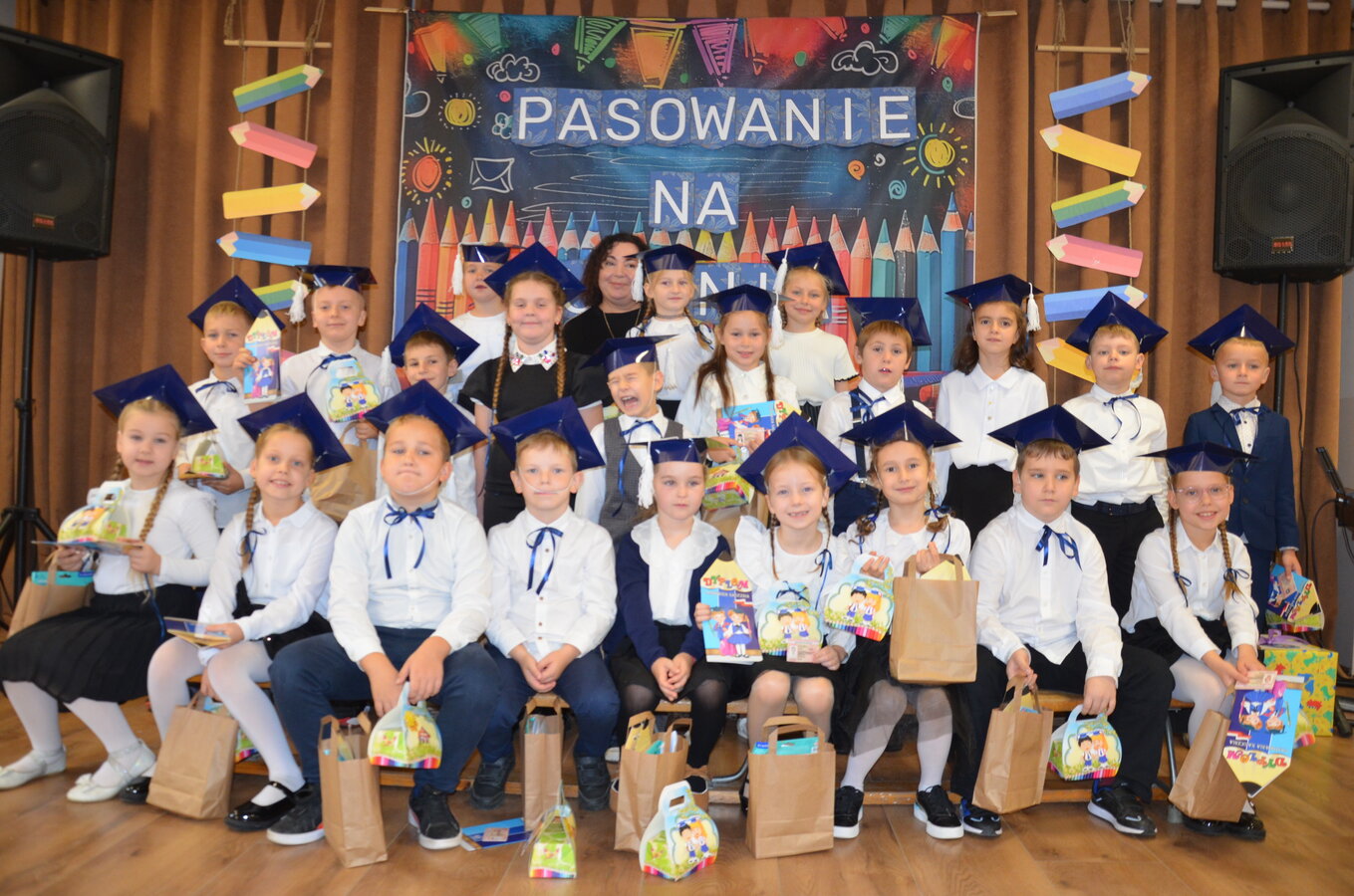 Dzisiaj 14.10.2025r. w naszej szkole odbyła się wyjątkowa uroczystość – Pasowanie dzieci z klasy pierwszej na Uczniów oraz uroczysta akademia z okazji Dnia Edukacji Narodowej. Był to dla nich szczególny dzień. Przybyły do szkoły w galowych strojach w towarzystwie Rodziców z dumą zaprezentowały swoje umiejętności zdobyte podczas pierwszego miesiąca nauki. Pokazały, jak pięknie potrafią śpiewać i recytować wiersze. Zostały serdecznie powitane w gronie społeczności uczniowskiej przez starszych kolegów. Następnie odbyło się uroczyste ślubowanie, zaś punktem kulminacyjnym imprezy był akt pasowania dokonany przez Pana Dyrektor . Od tej chwili wszystkie dziewczynki stały się pełnoprawnymi uczennicami, zaś chłopcy – pełnoprawnymi uczniami Szkoły Podstawowej im Tadeusza Kościuszki w Jezierzycach Kościelnych.