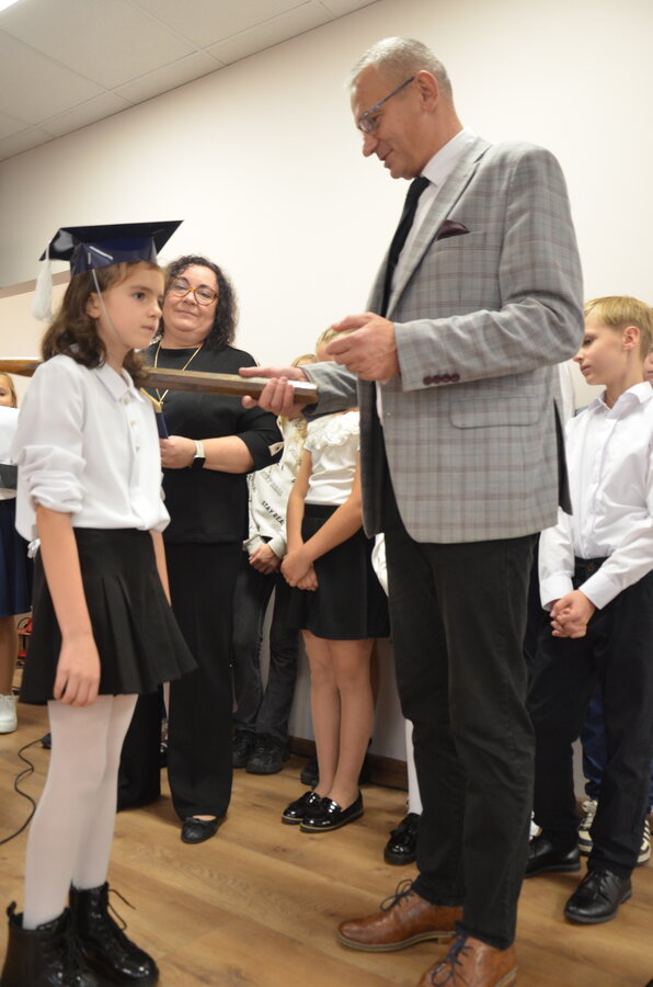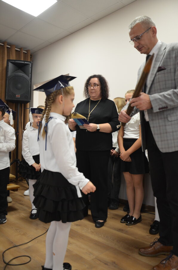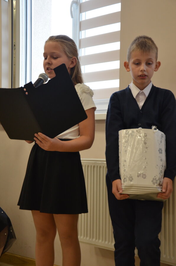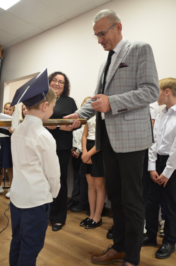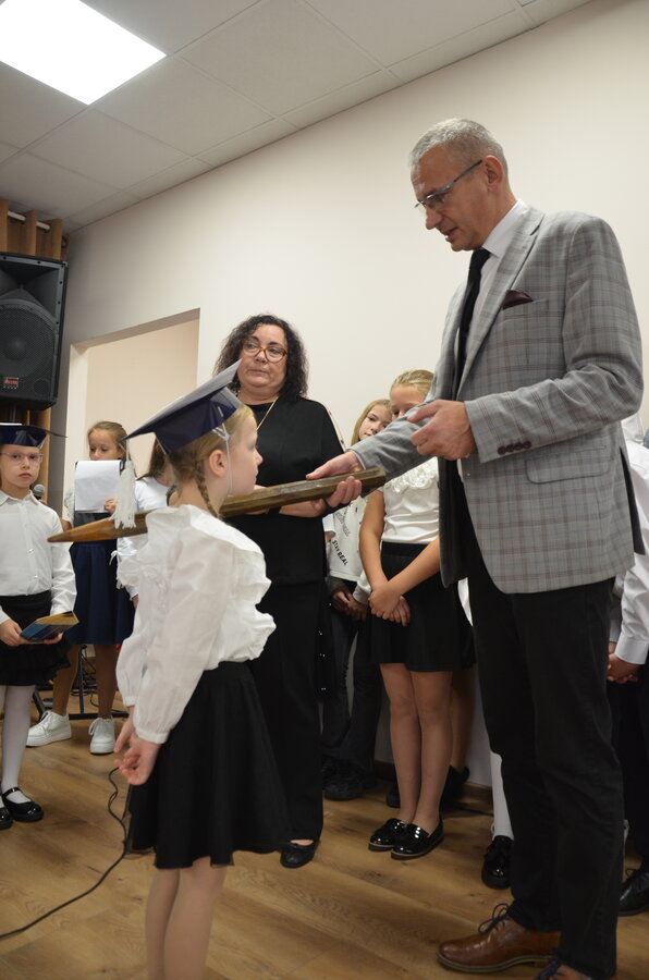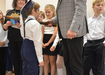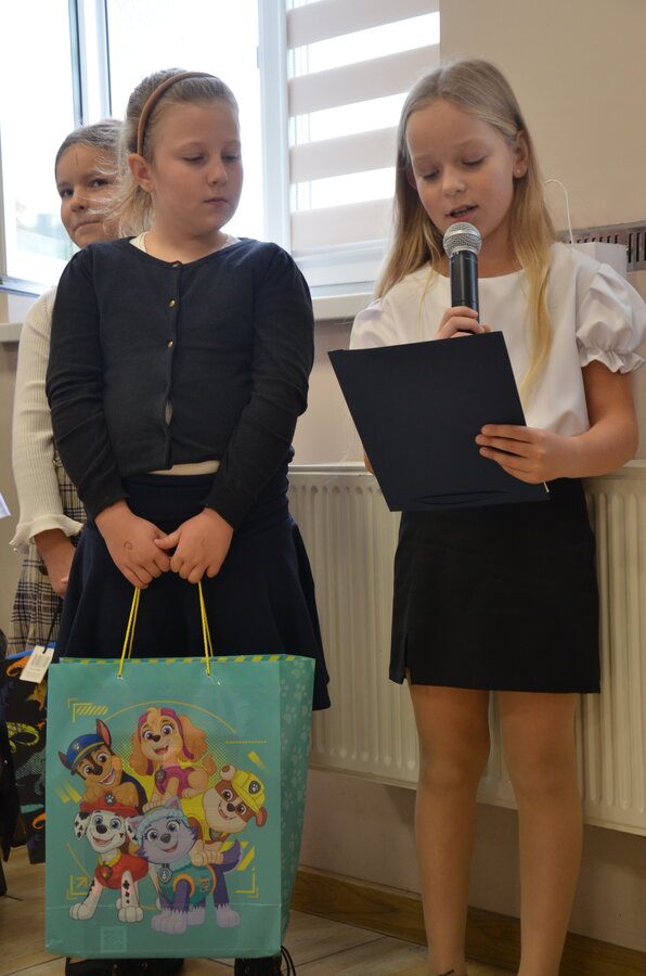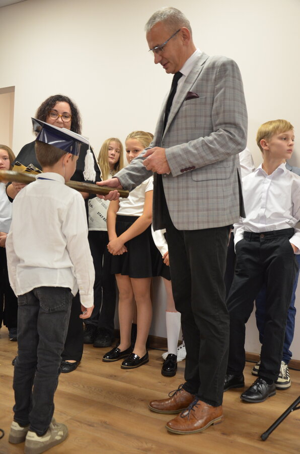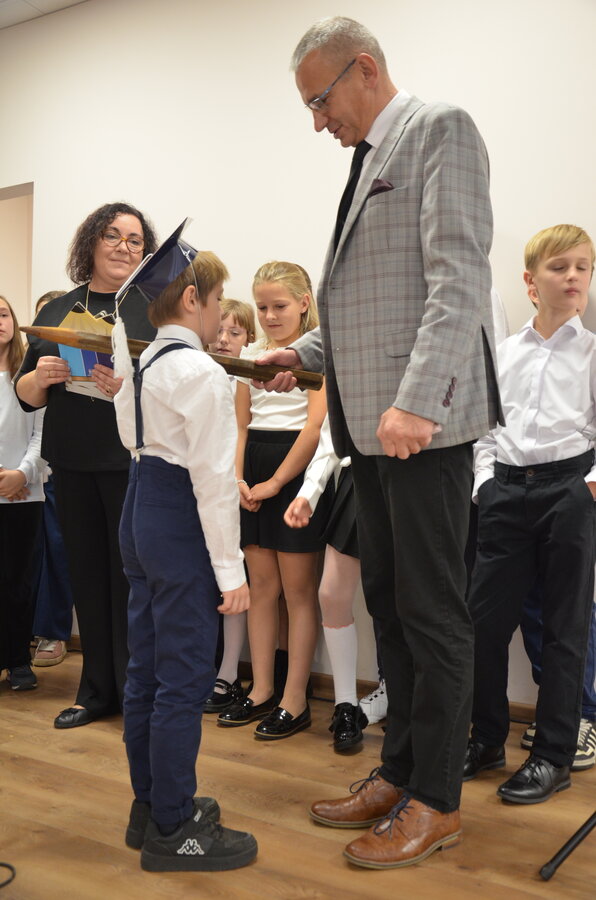 Dzisiaj 14.10.2025r. w naszej szkole odbyła się wyjątkowa uroczystość – Pasowanie dzieci z klasy pierwszej na Uczniów oraz uroczysta akademia z okazji Dnia Edukacji Narodowej. Był to dla nich szczególny dzień. Przybyły do szkoły w galowych strojach w towarzystwie Rodziców z dumą zaprezentowały swoje umiejętności zdobyte podczas pierwszego miesiąca nauki. Pokazały, jak pięknie potrafią śpiewać i recytować wiersze. Zostały serdecznie powitane w gronie społeczności uczniowskiej przez starszych kolegów. Następnie odbyło się uroczyste ślubowanie, zaś punktem kulminacyjnym imprezy był akt pasowania dokonany przez Pana Dyrektor . Od tej chwili wszystkie dziewczynki stały się pełnoprawnymi uczennicami, zaś chłopcy – pełnoprawnymi uczniami Szkoły Podstawowej im Tadeusza Kościuszki w Jezierzycach Kościelnych.