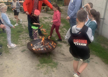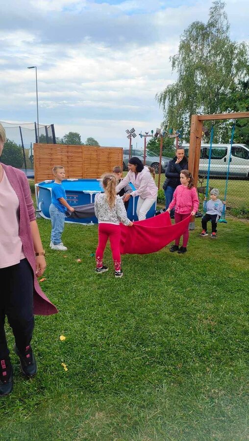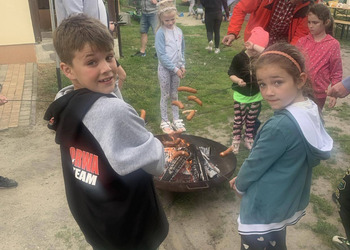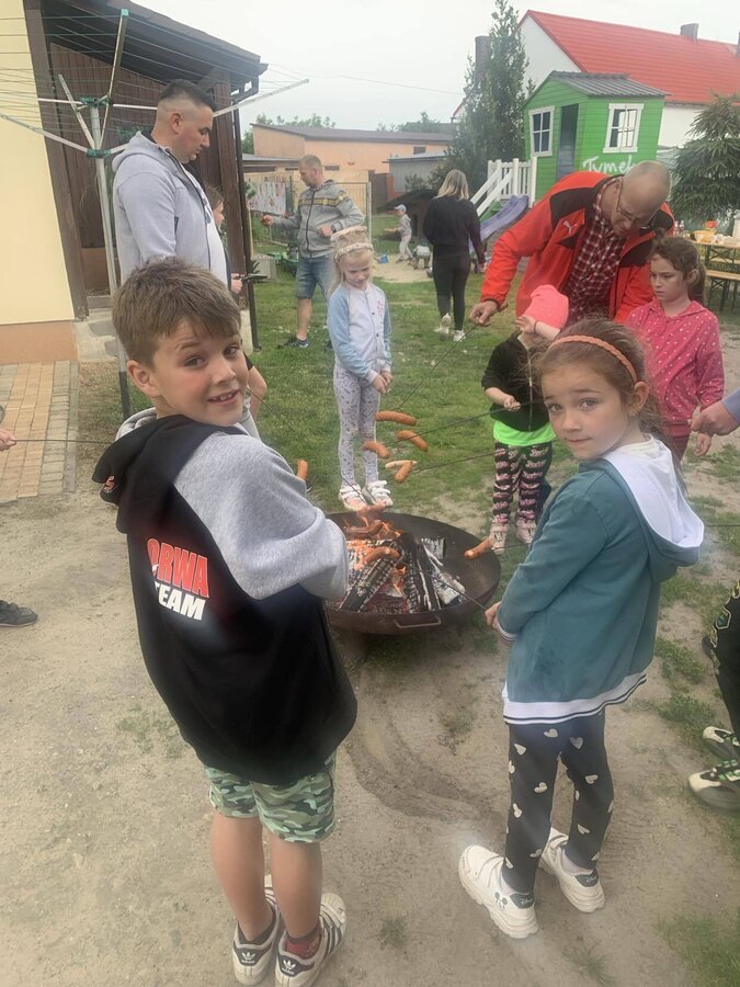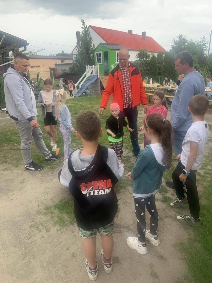 Dzień Rodziny to wspaniały czas dla dzieci i rodziców. Z tej okazji uczniowie klasy pierwszej oraz ich rodzice spotkali się się w ogrodzie państwa Maćkowiak. Najpierw dzieci zaprezentowały się w wierszach, piosenkach i tańcu. Wręczyły najbliższym laurki oraz upominki – kule kwiatowe, które wcześniej samodzielnie wykonały na zajęciach ekologicznych. Następnie wszyscy zasiedli do stołów, gdzie były ciasteczka, owoce i napoje. Później był czas na wspólne zabawy. Były różne konkurencje: wyścig z balonami, siatkówka balonowa, wyścigi taczek. Myślę, że dobrze bawiły się zarówno dzieci jak i rodzice. Na koniec był czas na smażenie kiełbasek, które wszyscy zajadali ze smakiem. Dziękuję bardzo osobom, które zapewniły poczęstunek dla wszystkich oraz państwu Maćkowiak za przygotowanie imprezki.