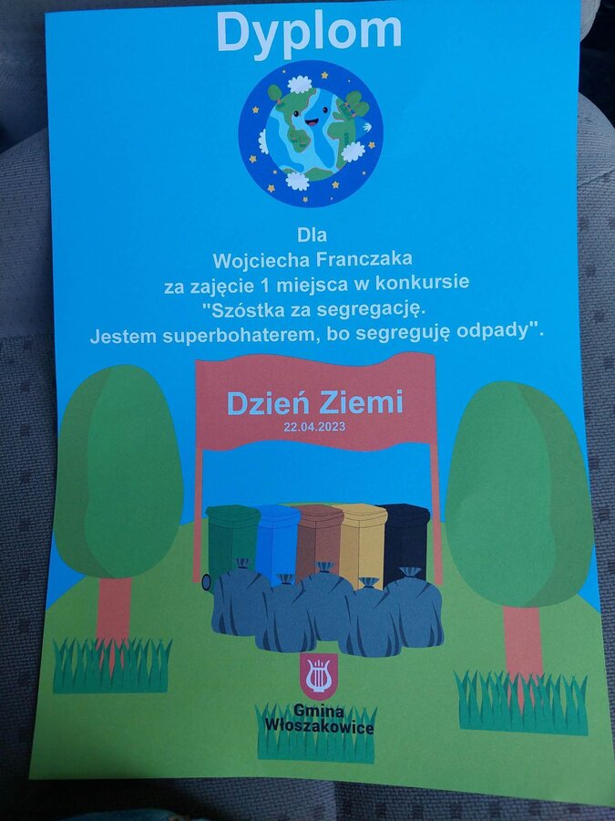 Miło nam poinformować, że uczeń klasy 2, Wojtek Franczak zajął 1 miejsce w ekologicznym konkursie plastycznym w kategorii klas 2 z okazji Dnia Ziemi. Hasło konkursu brzmiało:" Szóstka za segregację. Jestem superbohaterem bo segreguję odpady".